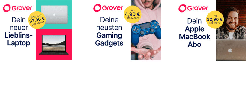 GroverGrover ist ein Angebot der Grover Group GmbH mit Sitz in Berlin. Im Onlineshop kannst du das Neueste aus der Welt der Technik mieten. Dass die aktuellen Geräte aus dem Hause Apple, Samsung, Nintendo oder Acer nicht direkt billig sind, ist kein Geheimnis. Doch du musst diese nicht zwingend käuflich erwerben, denn Dank Grover ist Technikmiete denkbar einfach und flexibel. Im Angebot sind nicht nur Smartphones, Laptops oder Spielkonsolen, sogar Haushaltsgeräte wie Dyson Staubsauger, hochwertige Kameras und Objektive von Canon oder E-Scooter von Segway können angemietet werden. Ob Unterhaltungselektronik, Home Office Ausstattung, Gaming oder Smart Home: So bist du immer mit dem neuesten Equipment am Start, schonst die Haushaltskasse und kannst auf Wunsch am Ende der Laufzeit das Gerät kaufen, weitermieten oder kostenlos zurücksenden.