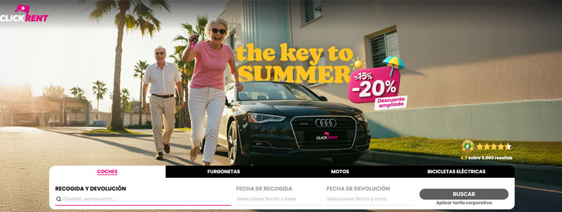 Buscas alquilar un coche de forma rápida, económica y sin complicaciones? ¡Bienvenido a ClickRent.es! Somos tu aliado ideal para explorar España con libertad, confort y confianza. Flota moderna y variada Desde coches compactos perfectos para la ciudad, hasta SUV ideales para aventuras en carretera – en ClickRent encontrarás el vehículo que se adapta a tus necesidades. Precios transparentes y sin sorpresas Olvídate de los cargos ocultos. En ClickRent.es te ofrecemos tarifas claras, competitivas y con todo incluido. Oficinas en los principales destinos turísticos Mallorca, Ibiza, Alicante, Málaga, Barcelona… estés donde estés, estamos cerca de ti para darte un servicio ágil y personalizado. Reserva online fácil y rápida. En tan solo unos clics puedes tener tu coche listo. ¡Reserva hoy mismo y empieza tu viaje sin estrés!